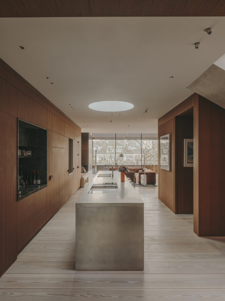 Im Kontrast dazu ist die Küche aus Edelstahl geformt und verleiht dem Raum eine raffinierte, fast monolithische Präsenz. Das Zusammenspiel von warmem, organischem Holz und kühlem, präzisem Metall erzeugt eine ausgewogene Spannung — ein Markenzeichen zeitgenössischer Handwerkskunst.