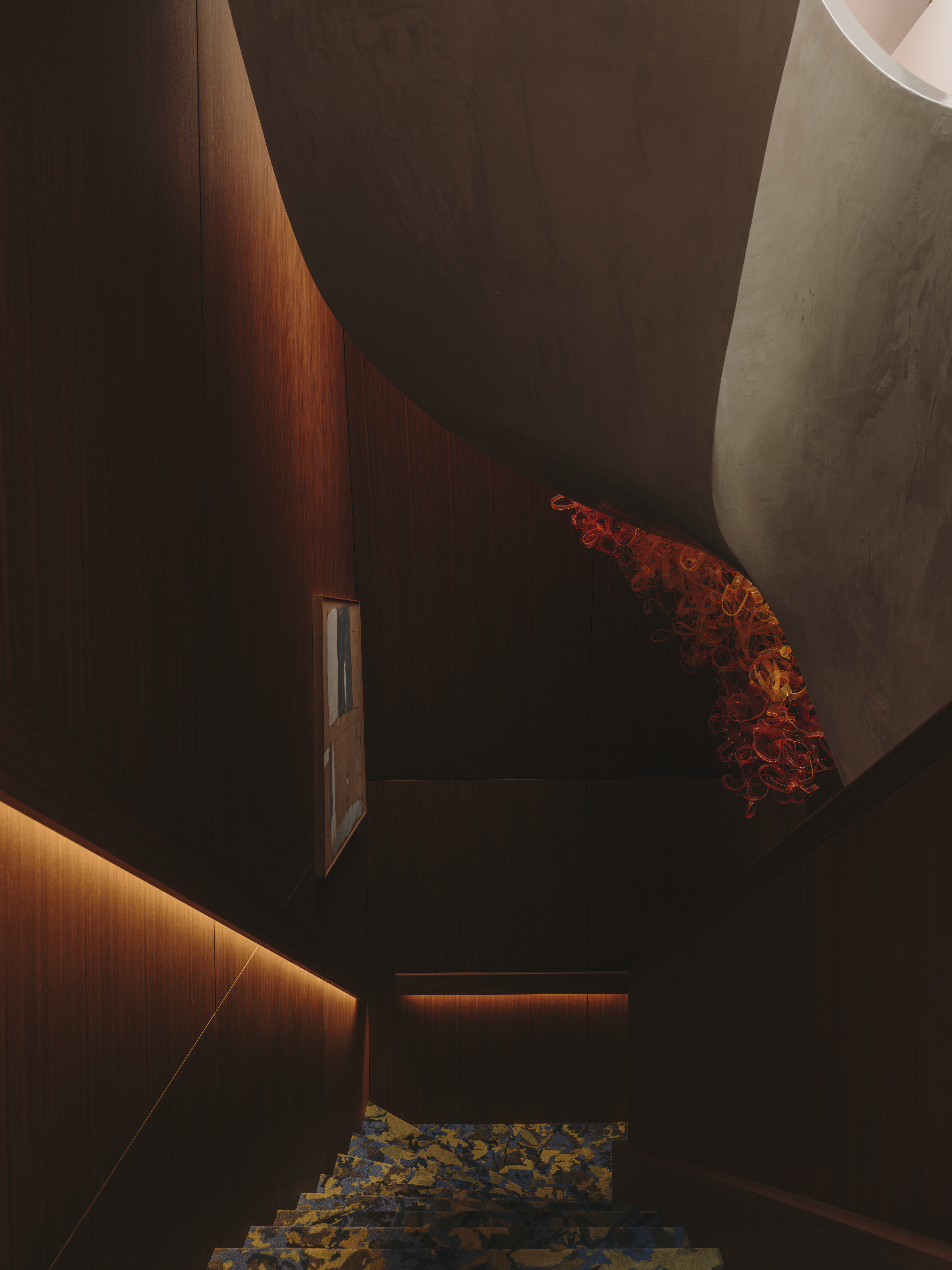Eine skulpturale Wendeltreppe erhebt sich wie ein Installationselement und verbindet den zentralen Wohnbereich mit einem ruhigen Arbeitszimmer und einer privaten Dachterrasse. Diese vertikale Bewegung verleiht dem Raum Rhythmus und räumliche Spannung, ohne die mühelose Schlichtheit zu beeinträchtigen.