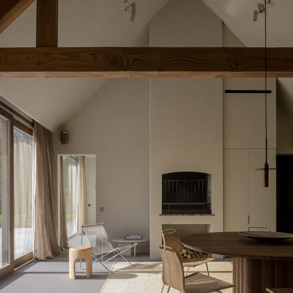 Von außen bewahrt das Gebäude seine ländliche Seele: Ein Satteldach, bedeckt mit erdigen Terrakottafliesen, getragen von Holzrahmenfenstern, die die flämische Landschaft einrahmen. Im Inneren wandelt sich die Atmosphäre in eine Welt der Balance und Zurückhaltung. Natürliches Licht strömt durch großflächige Verglasungen, Vorhänge legen sich in sanften Schichten nieder und fühlbare Materialien laden zu einem entschleunigten Lebensrhythmus ein.