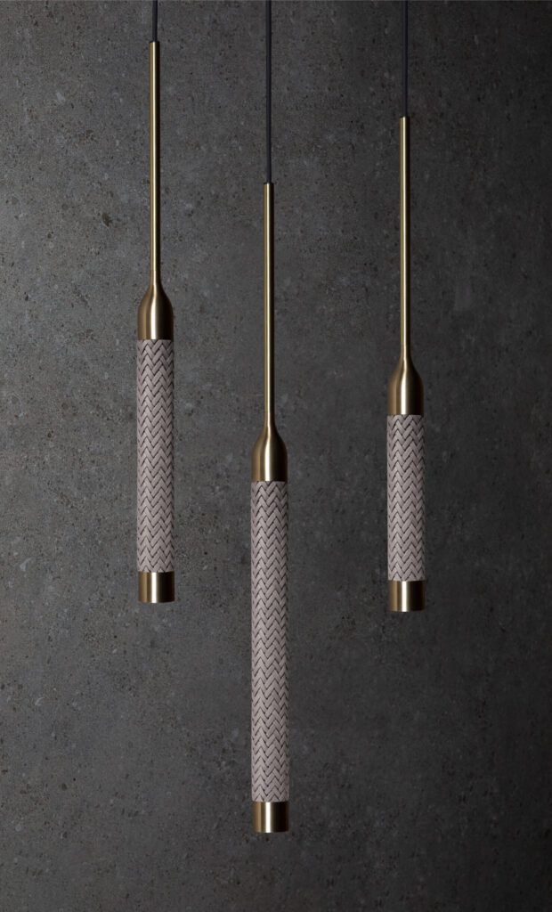 Sorgfältig in den vertikalen Schaft ausgewählter Leuchten integriert, lädt geflochtenes Leder zu einem haptischen Erlebnis ein, das so durchdacht erscheint, wie es aussieht – es verleiht Wärme, Kontrast und handwerkliche Verfeinerung an skulpturale Formen.