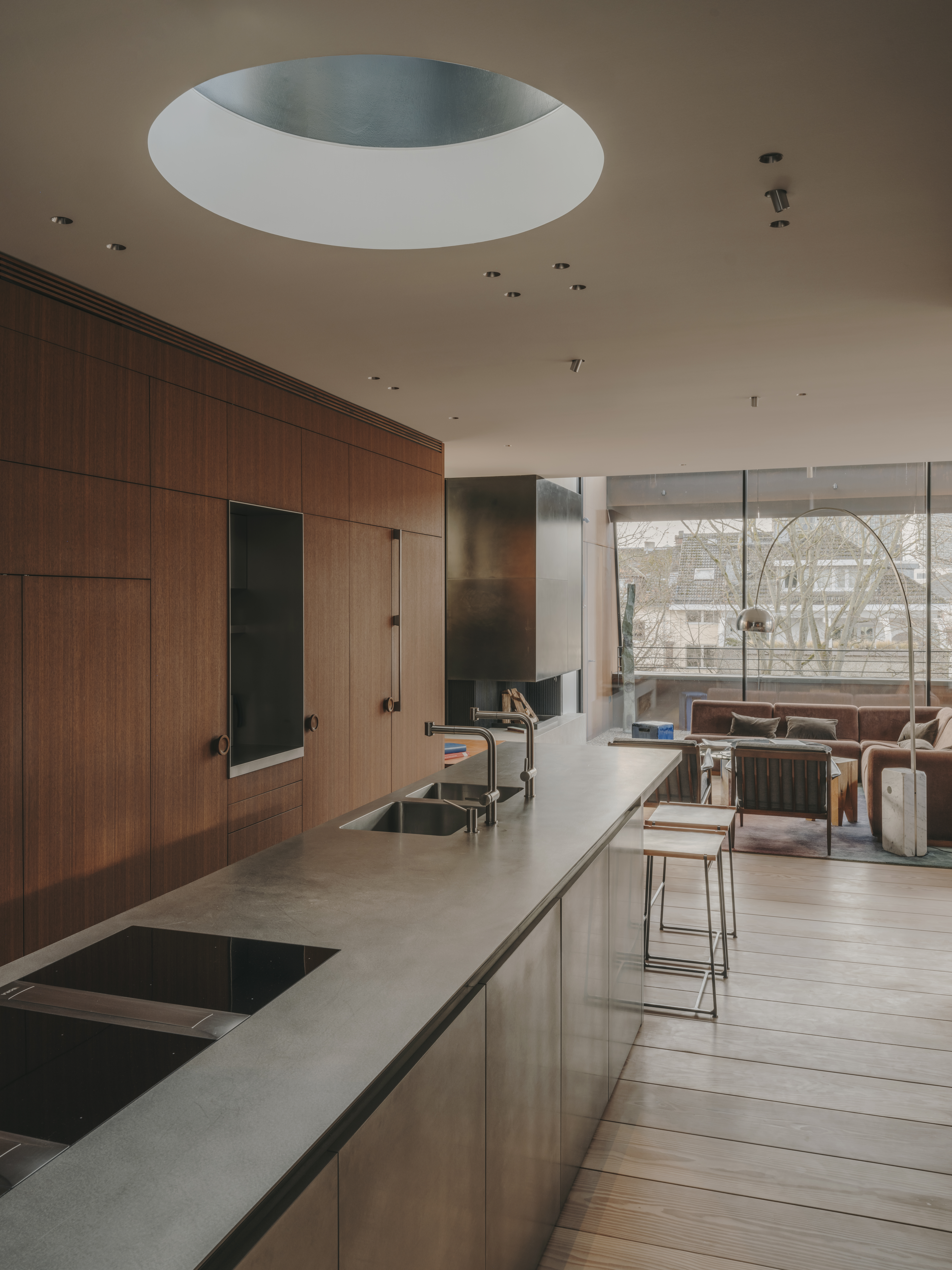 In Frankfurt’s historic Westend, a traditional attic has been transformed into a serene penthouse defined by light, precision and an uncompromising approach to materials. The architect reinterpreted the classic mansard structure, opening the space toward the sky and creating a vertical expression that frames both the city and the surrounding treetops.