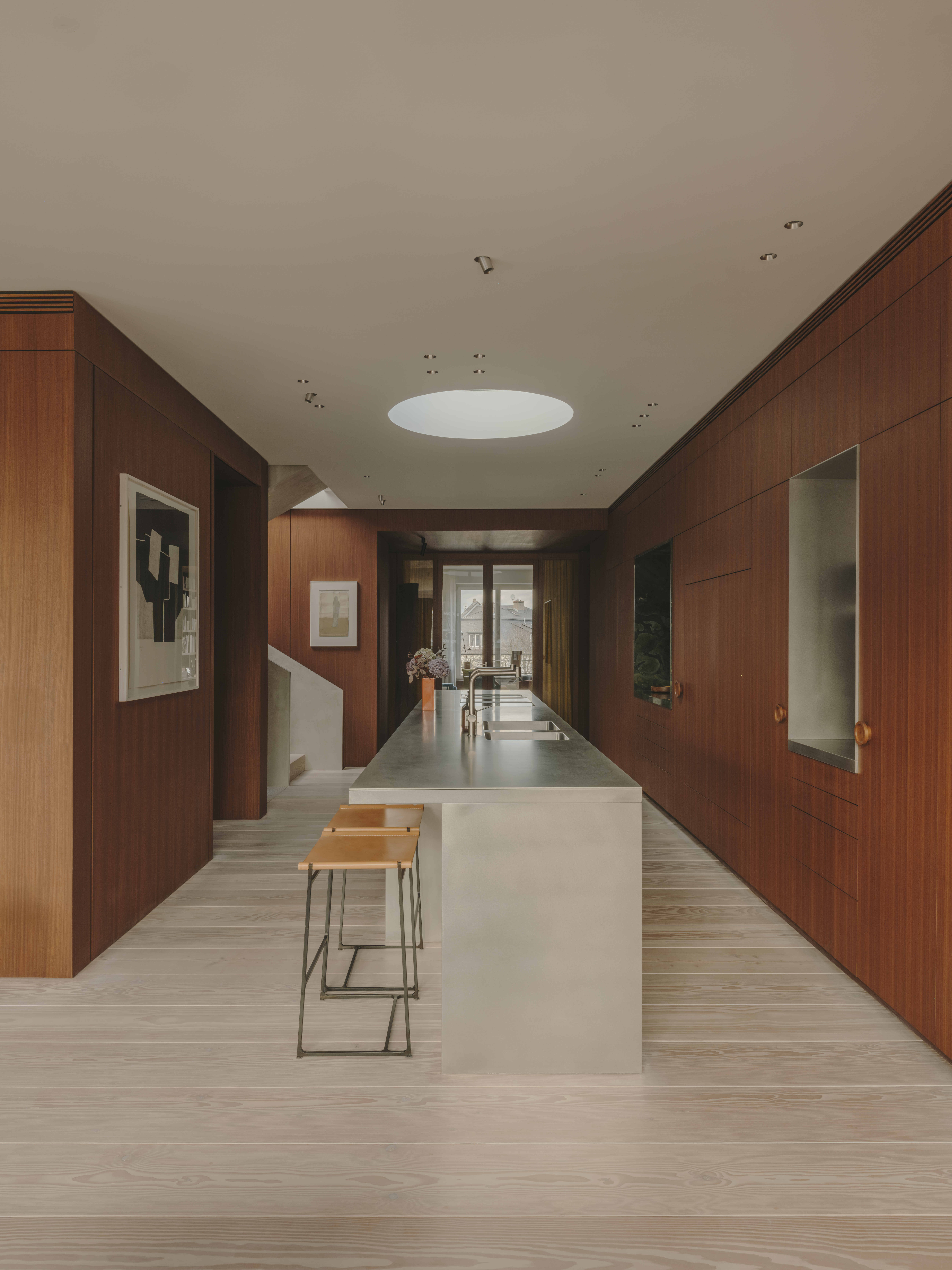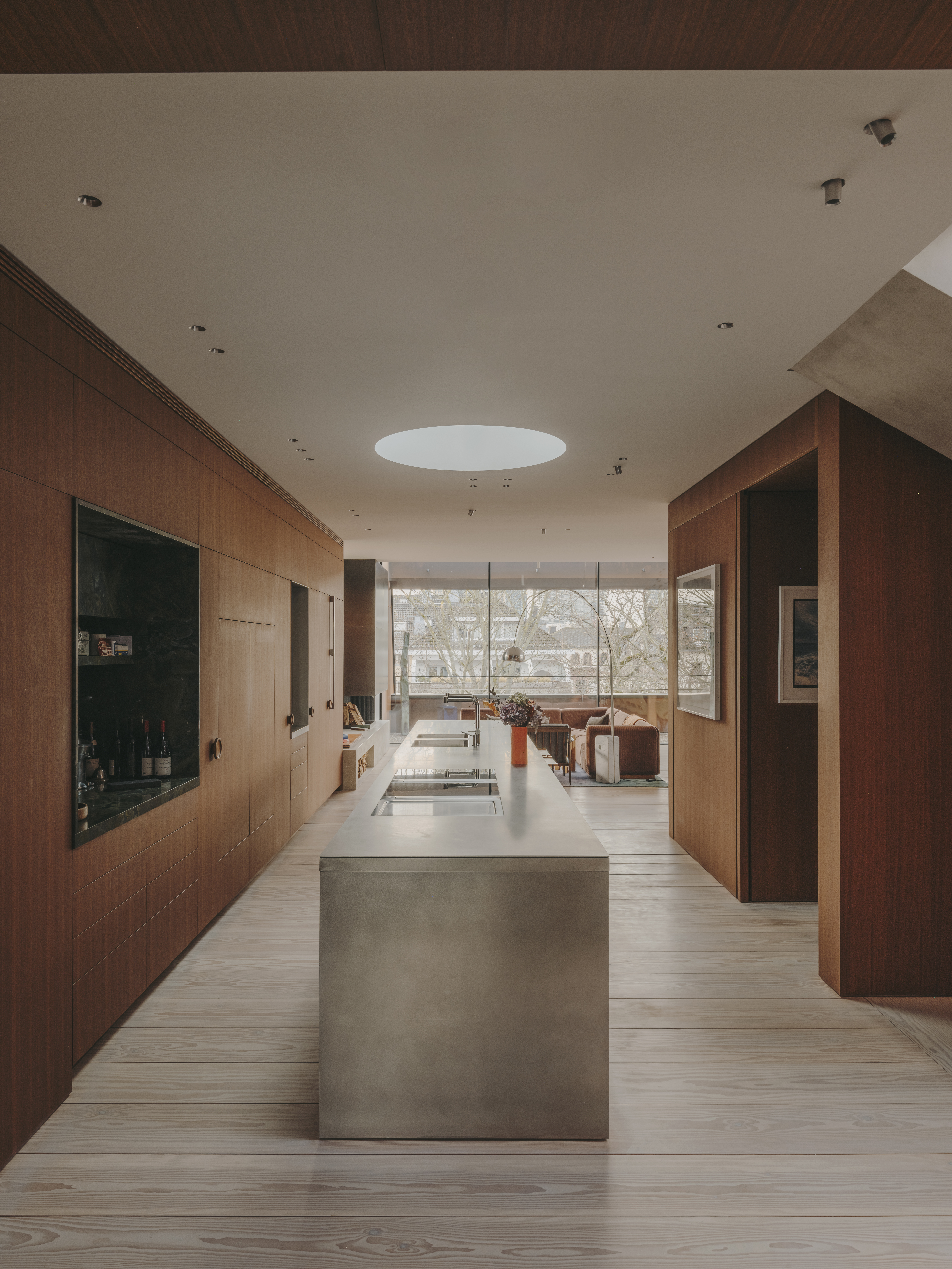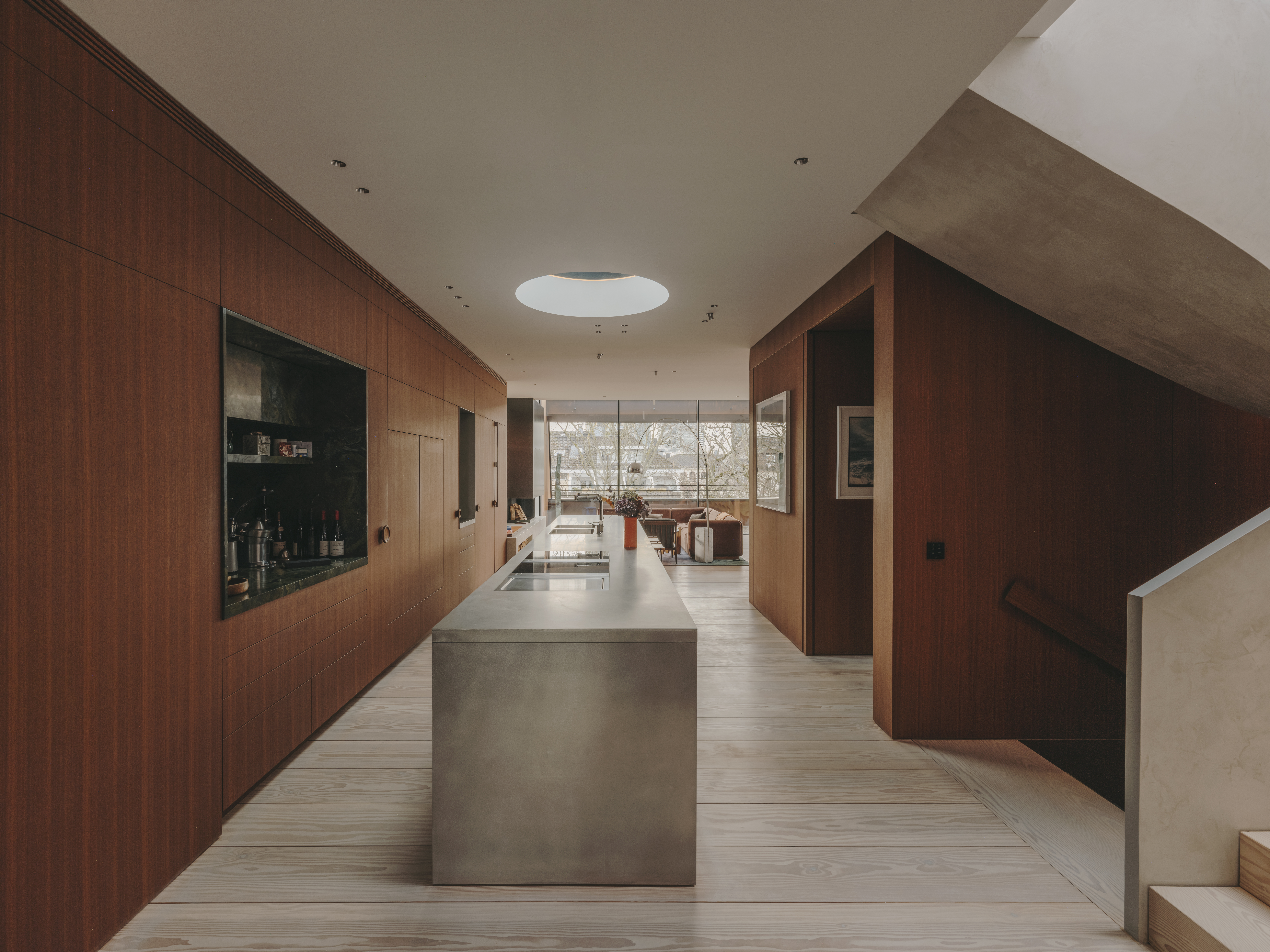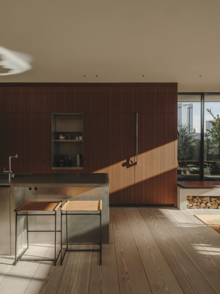 In contrast, the kitchen is sculpted from stainless steel, giving the room a refined, almost monolithic presence. The meeting between warm, organic wood and cold, precise metal creates a balanced tension — a hallmark of contemporary craftsmanship.