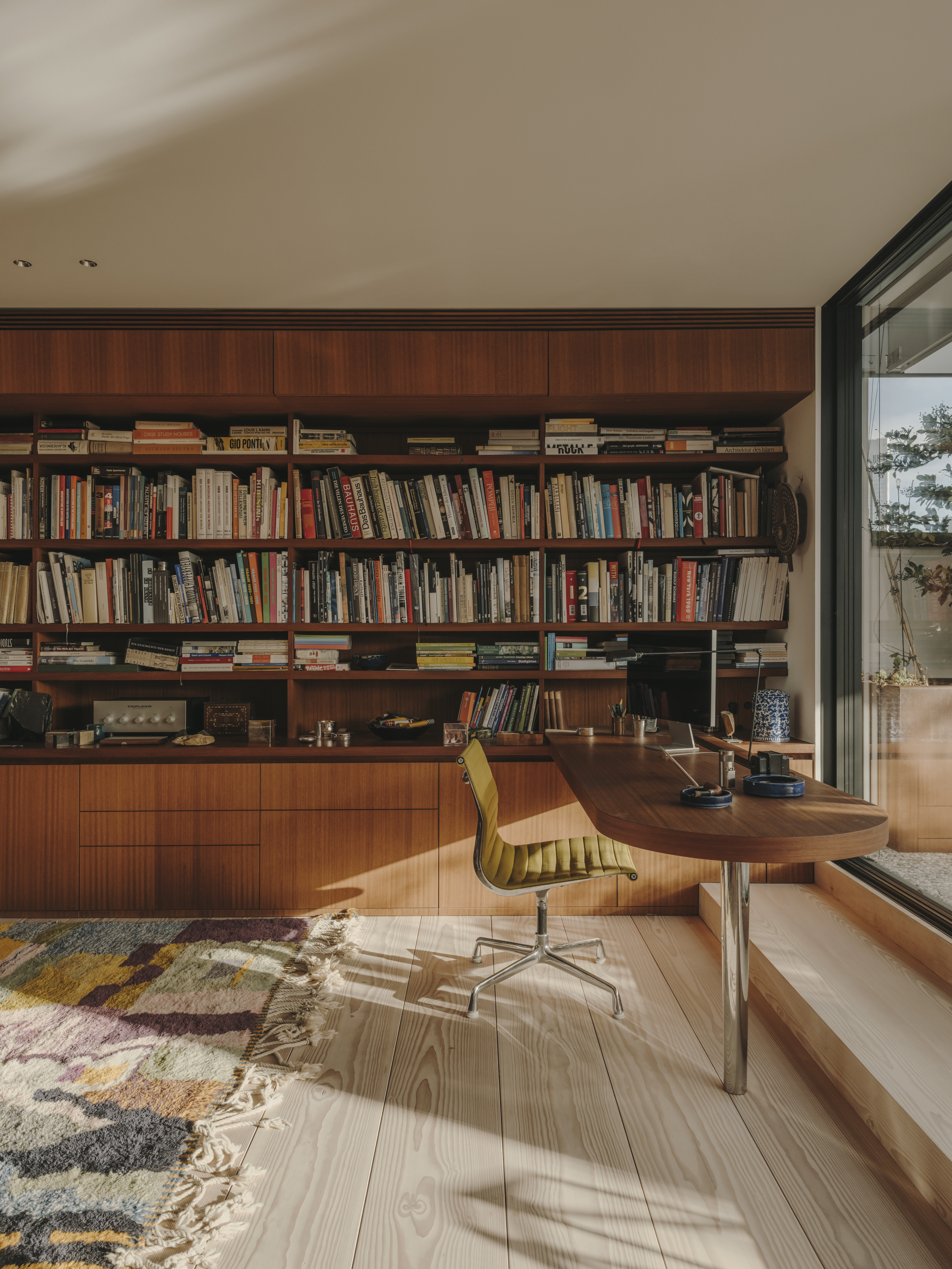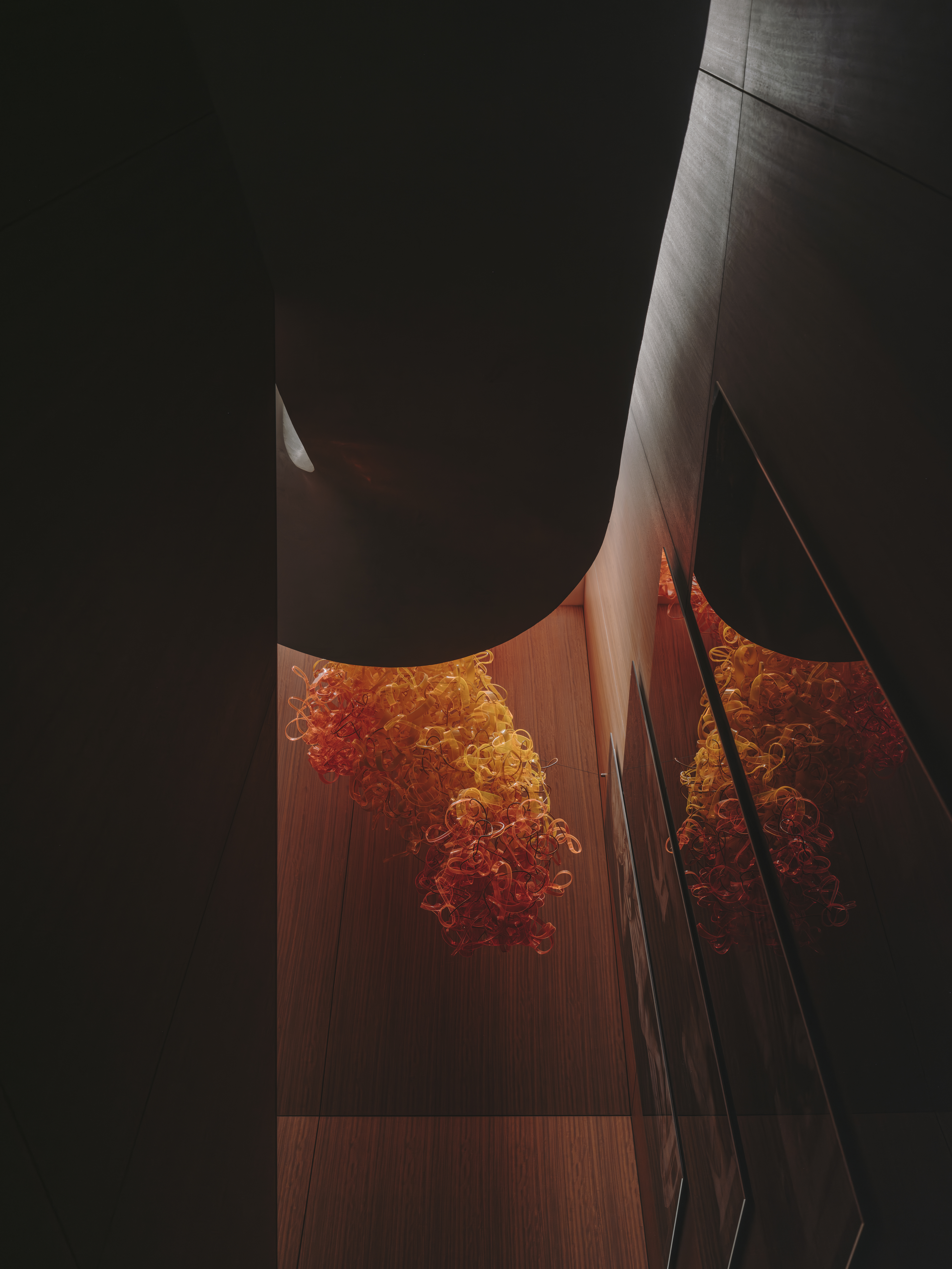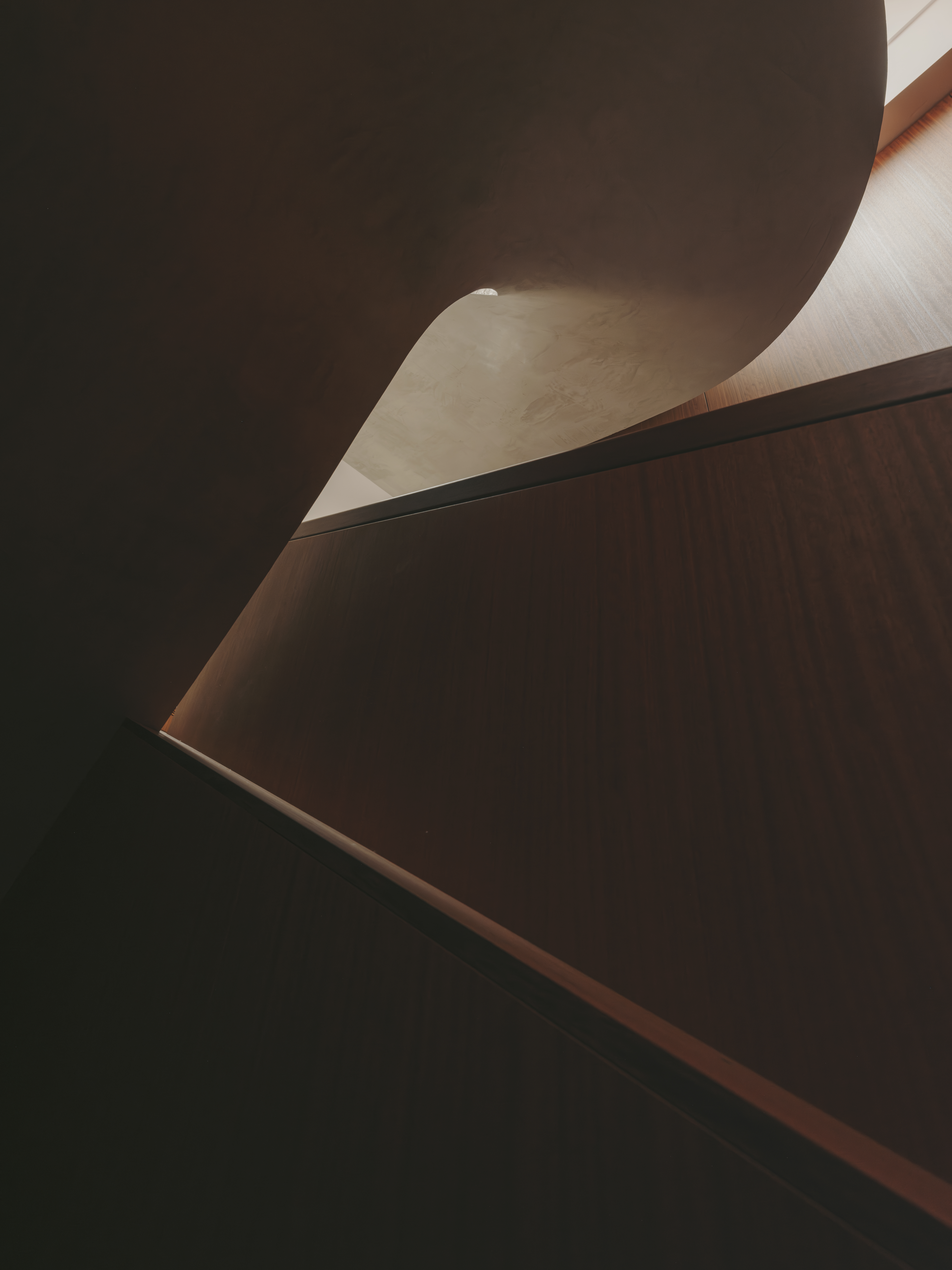 Inside, warm Kambala wood panels wrap the interior, creating an atmosphere of calm and tactile richness. These natural surfaces interact beautifully with daylight, shifting in tone and depth as the sun moves through the space.